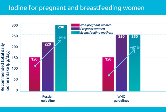 In the weeks after the birth the thyroid hormone production and the excretion of iodide by urine return to normal in comparison to the time when you have been pregnant. But nevertheless your need for iodine is increased, if you want to breastfeed your child. The reason for this is that breast milk is the single major source of iodine for breast fed infants during the important period of brain development. This means parts of the iodine which you have taken by food or iodine supplementation concentrates in the mammary glands. If your child gets breastfed the iodine is transferred to the infant via the breast milk. To ensure that the infant gets enough iodine from breast milk to build reserves in the thyroid gland, it is recommended that breastfeeding mothers should continue to consume more iodine than non-pregnant women. Therefore UNICEF, ICCIDD and WHO recommend an increased daily intake of 250 μg instead of 150 μg for adults in general.